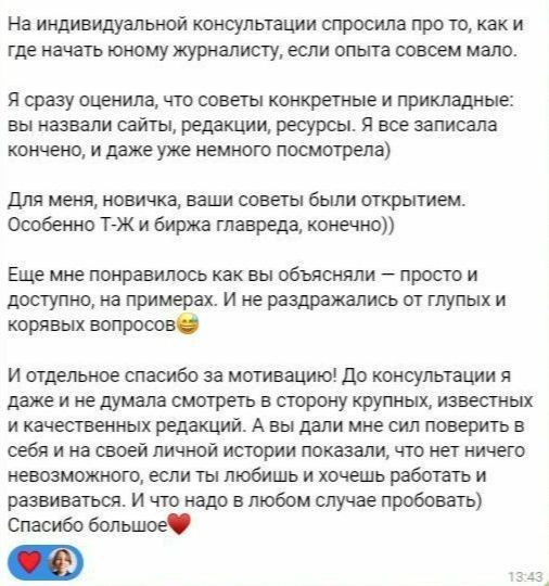 «Я курировал направление Текст на медиафоруме „ШУМ-2023“. Таню позвал в качестве эксперта-спикера. Она провела две образовательные встречи: „Как писать крутые тексты для медиа“ и „Разборы текстов“, проверяла домашки, помогала ребятам с проектами. Опыт большой, дело свое явно знает — я доволен.»
