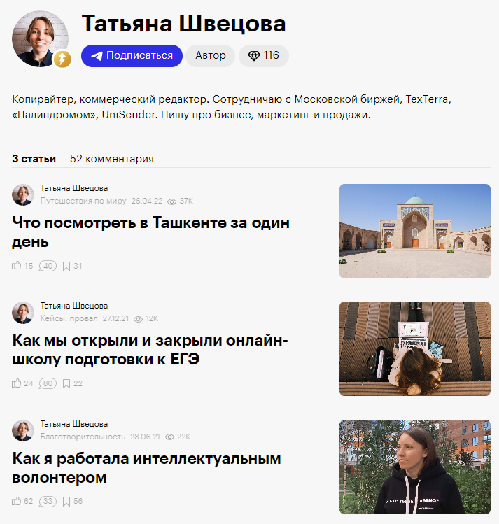 → Пишу про маркетинг, бизнес, удаленку, фриланс, образование, психологию, право.